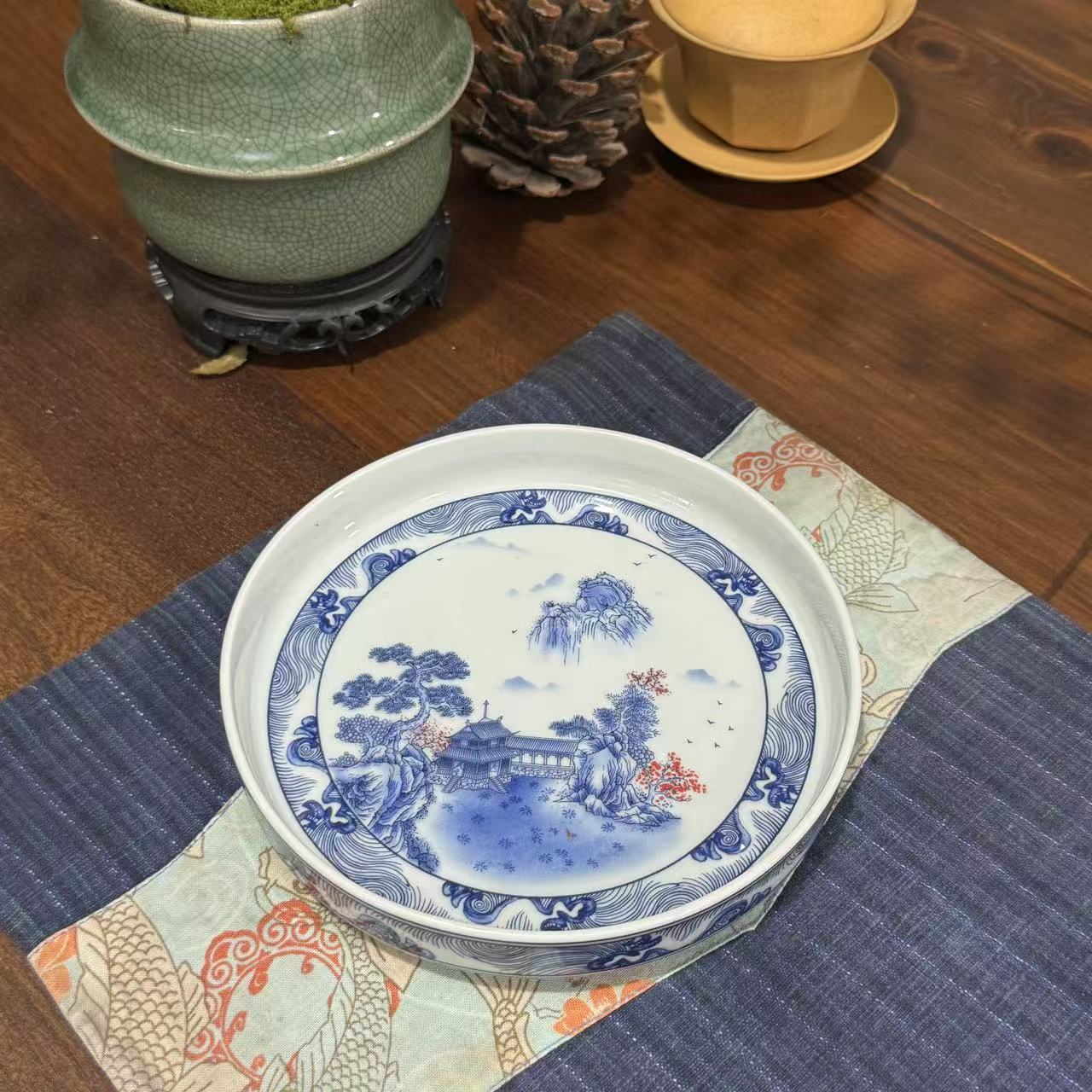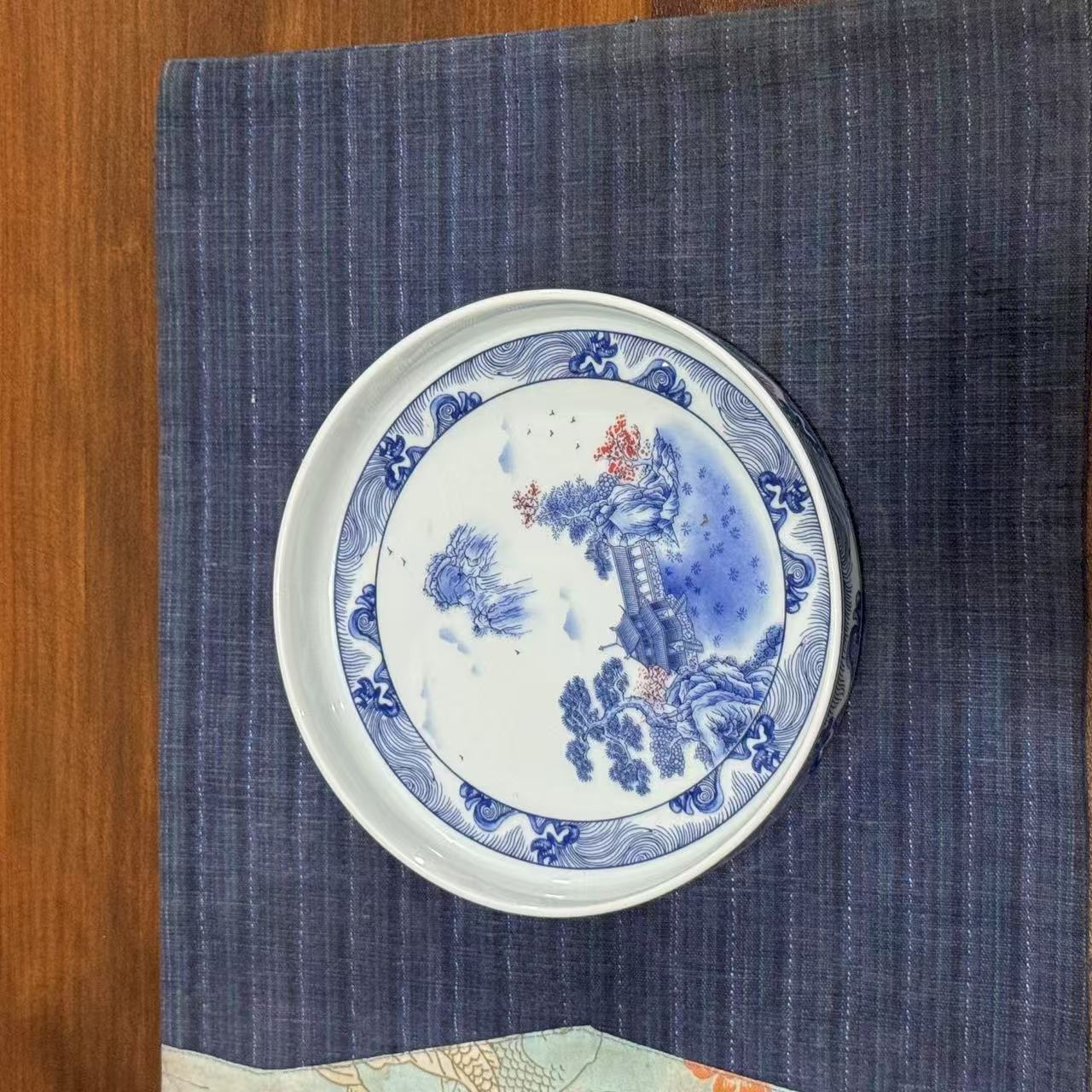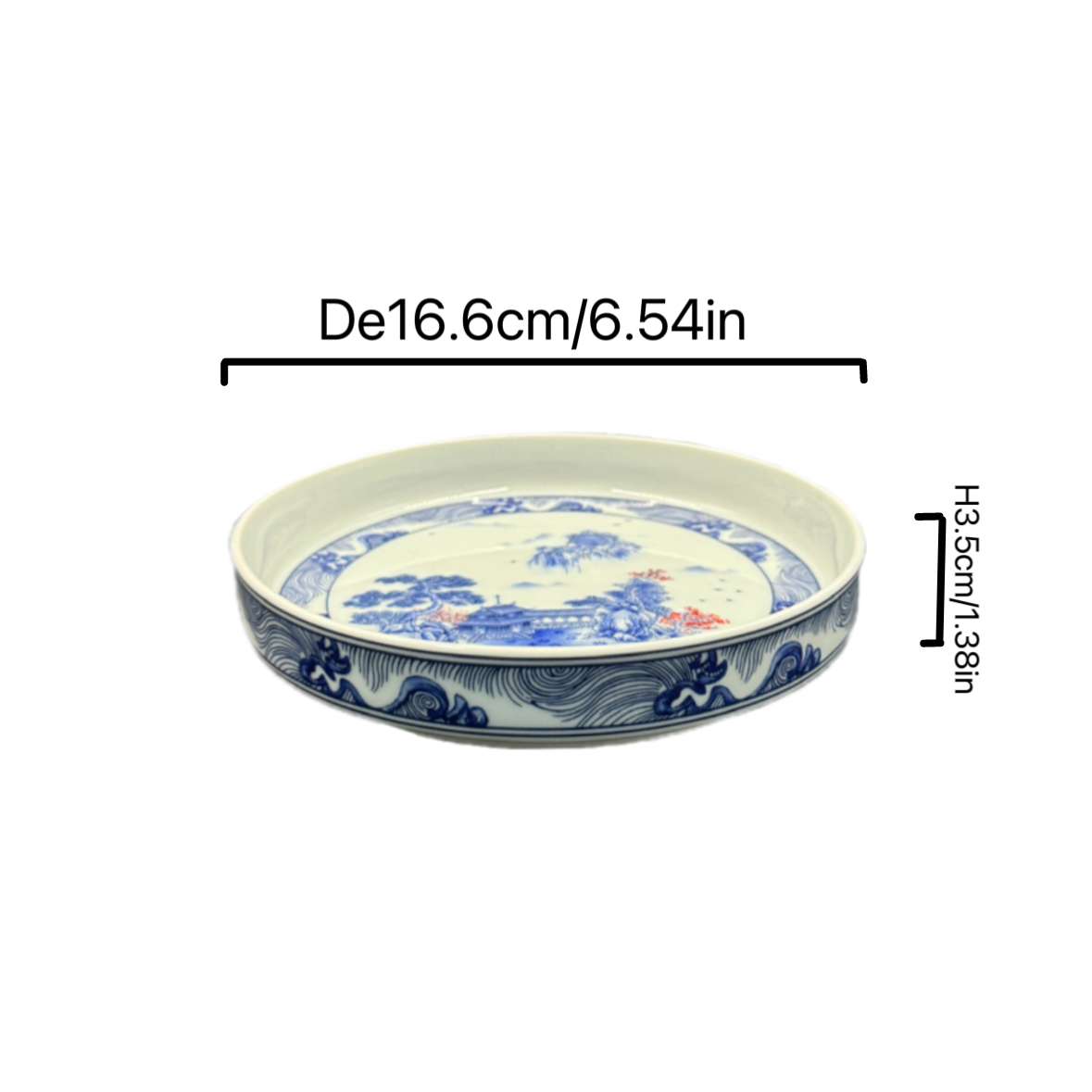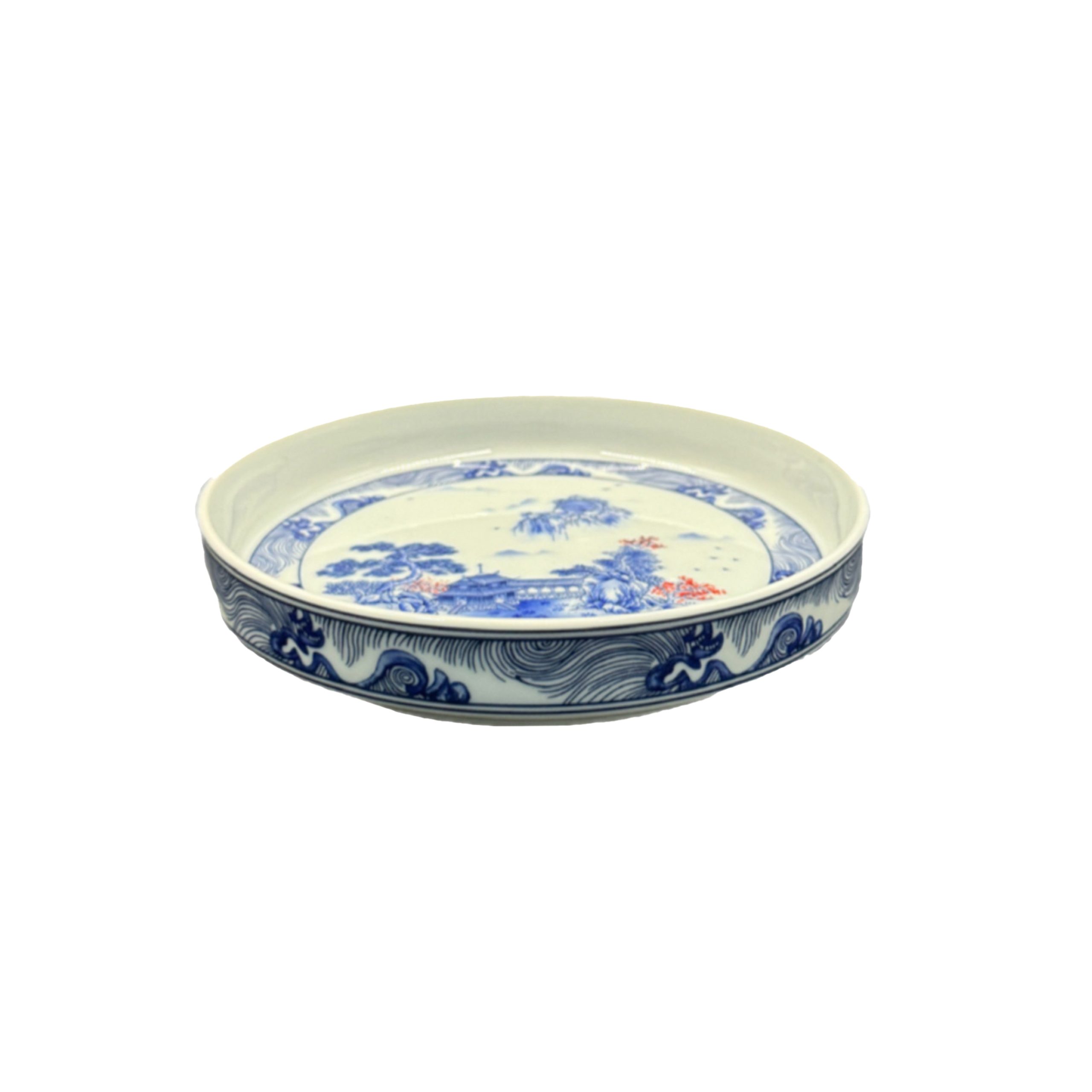 Enhance your space with this blue and white Chinese ceramic tray featuring traditional landscape, architecture, and red leaf designs. Perfect for home decor, serving fruits, or organizing small items.